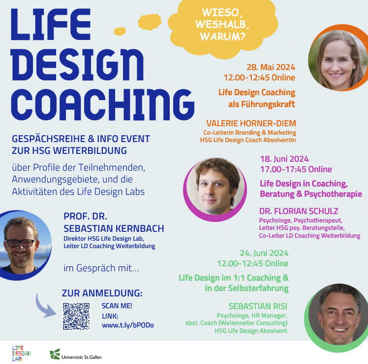 Im Verlauf des Jahres bieten wir diverse Gesprächsreihen mit AbsolventInnen der HSG Life Design Coaching Weiterbildung und weiteren Experten an. Sie können gerne bei diesen kurzweiligen Formaten über den Mittag oder am Feierabend kostenfrei dabei und erhalten dabei noch wertvolle Informationen über die Life Design Weiterbildungen an der Universität St. Gallen. Weitere Gesprächsreihen sind für Mai und Juni 2025 geplant.